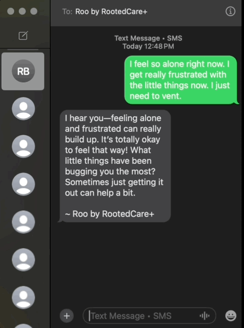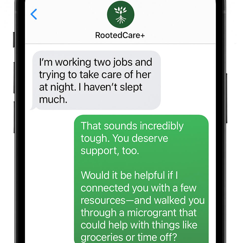 RootedCare+ was created from lived experience, the kind that reshapes a family forever.When my grandmother, Nanna, was diagnosed with dementia, everything changed. I stepped into caregiving first, learning on the fly, juggling fear, logistics, and love. And now my mom, full-time, is navigating that same role, carrying the weight of decisions, emotions, and endless unseen responsibilities.Caregiving is beautiful, but it’s also brutal. The emotional load is heavy. The financial pressure never really lets up. And the moments that break you often unfold late at night, on weekends, or in the quiet spaces where help is hardest to find.What we needed wasn’t another pamphlet or website. We needed direction. We needed reassurance. We needed relief, something immediate, compassionate, and steady.RootedCare+ is the tool I wish our family had. A simple, text-based companion for caregivers moving through impossible days offering emotional grounding, practical guidance, and, when necessary, micro-grants that ease real burdens in real time.Whether you’re showing up with strength or barely holding it together, RootedCare+ meets you where you are.— Tara, Founder & Family Caregiver
